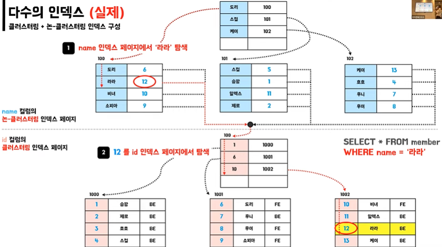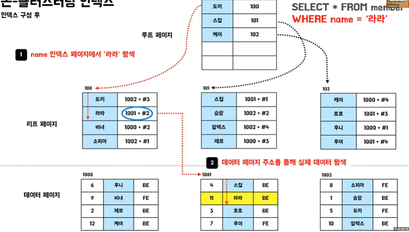 ❓ 왜 예상과 다르게 name 컬럼 인덱스 페이지에 데이터 페이지 주소가 들어가지 않고 클러스터링 인덱스 컬럼의 실제값이 들어갈까?