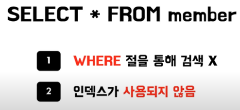 - 풀 테이블 스캔 : 순차적으로 처음부터 끝까지 조회