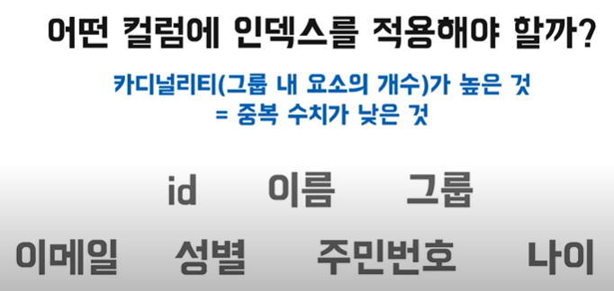 - 카디널리티(그룹 내 요소의 개수)가 높은 것 = 중복 수치가 낮은 것!